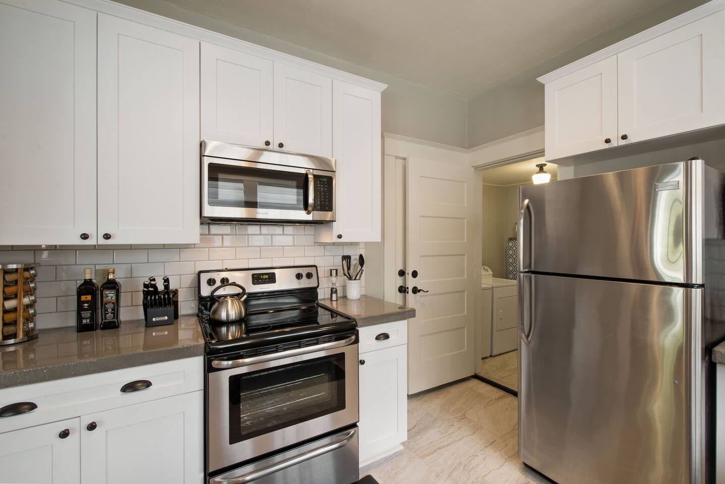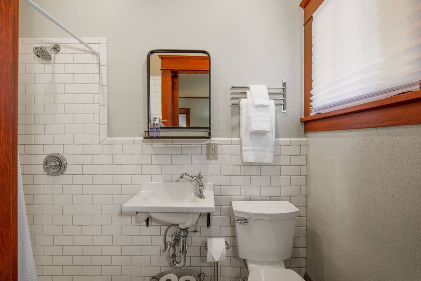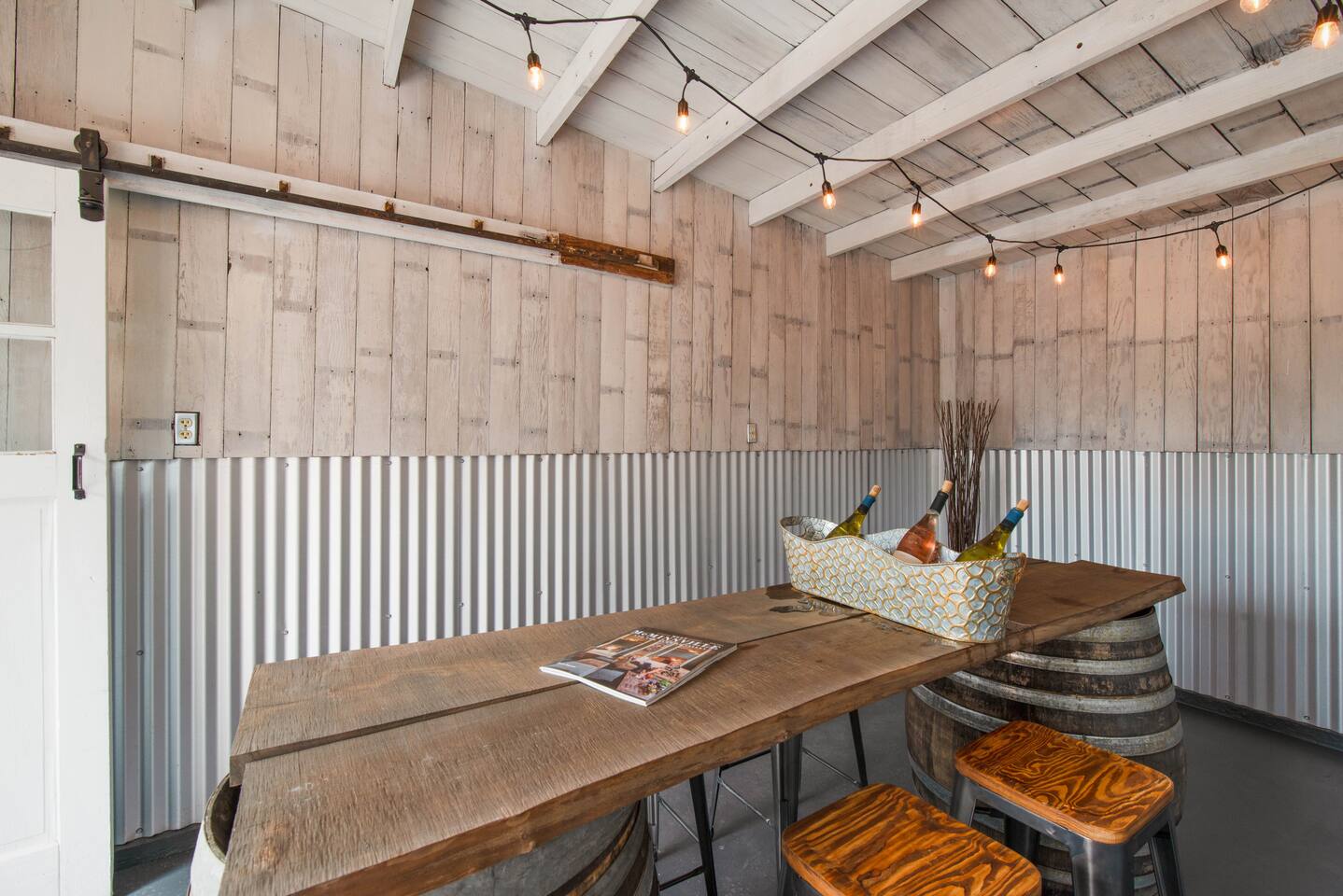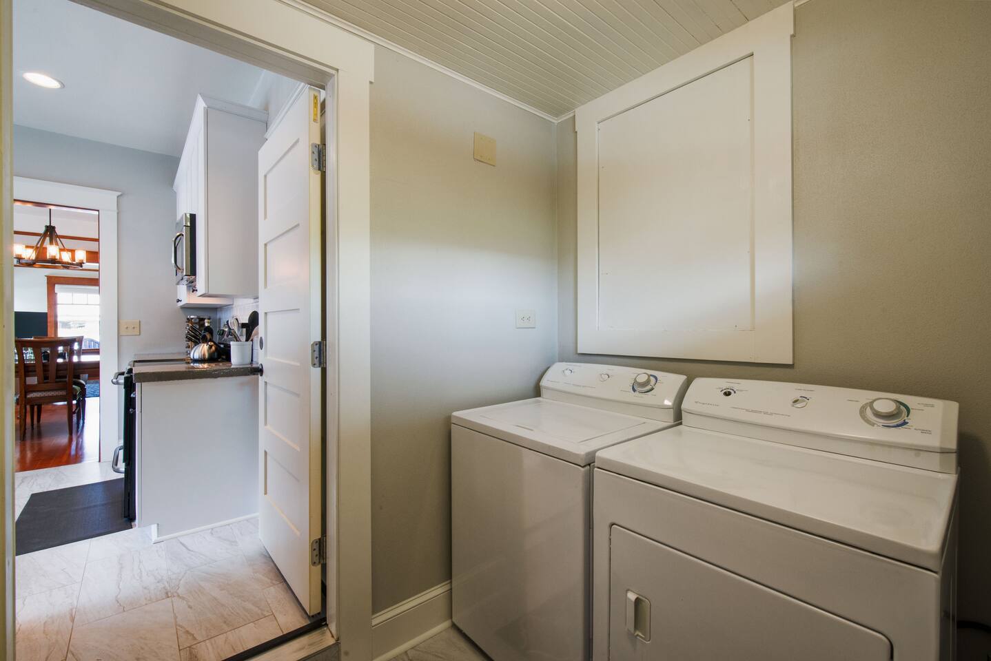 Traveling with a larger group? Ask about the Wine Country Farmhouse & 1939 Vintage House - all in downtown McMinnville Morning Coffee: Enjoy locally roasted whole bean coffee from Table Top Roasters in Yamhill. In the kitchen, there will be a drip coffee maker, coffee grinder, creamer, and sugar. Fully Stocked Kitchen: Open the cabinets and drawers, and you'll find everything you need to whip up a quick meal or cook and bake your favorite holiday meals. The kitchen is also supplied with a spice rack, olive oil, vinegar, BBQ utensils, a meat thermometer, hot-pads, kitchen towels, and extra paper towels. 1910 Carriage House & Connected Outdoor Space: The historic 1910 Carriage House has been beautifully restored into a covered outdoor gathering and dining space, with a charming original 1910 roller that opens the entire side of the Carriage House to the fully fenced outdoor space. The BBQ sits right at the doorway for easy indoor/outdoor entertaining, connecting to outdoor seating, a sun umbrella, lounge chairs, outdoor heating, and twinkle lights. Fireplace: There is a cozy electric fireplace in the living room. Dog Friendly: We welcome your dog, and there is plenty of room for them to roam in the fully fenced outdoor space. (See our dog policy, but if your situation is a little different, don't hesitate to ask management to see if we can accommodate). Free Parking: As you pull up to the house, there is one paved parking space in front of the fence. You can also park on the street for free. Connectivity: High-speed Wi-Fi suitable for streaming and remote work. SmartTV: Connect to your favorite app channels, and there are 100's of live TV shows, news, movies, and music. Dining Table & Workspace: The dining room table is very large and provides a lot of space. We have known guests to travel here and do a remote work "staycation" - they had plenty of room spread out and set up shop during the day. This table is also great for entertaining and playing games.
