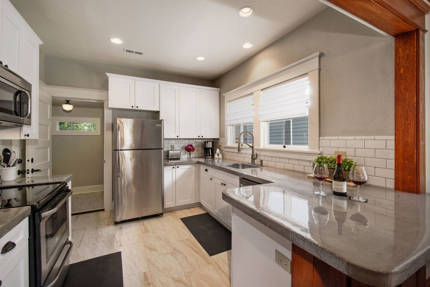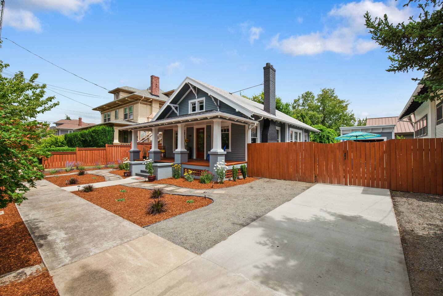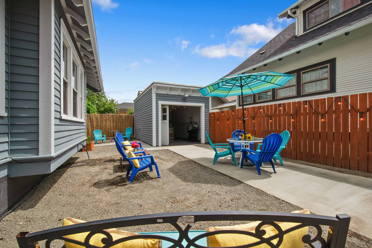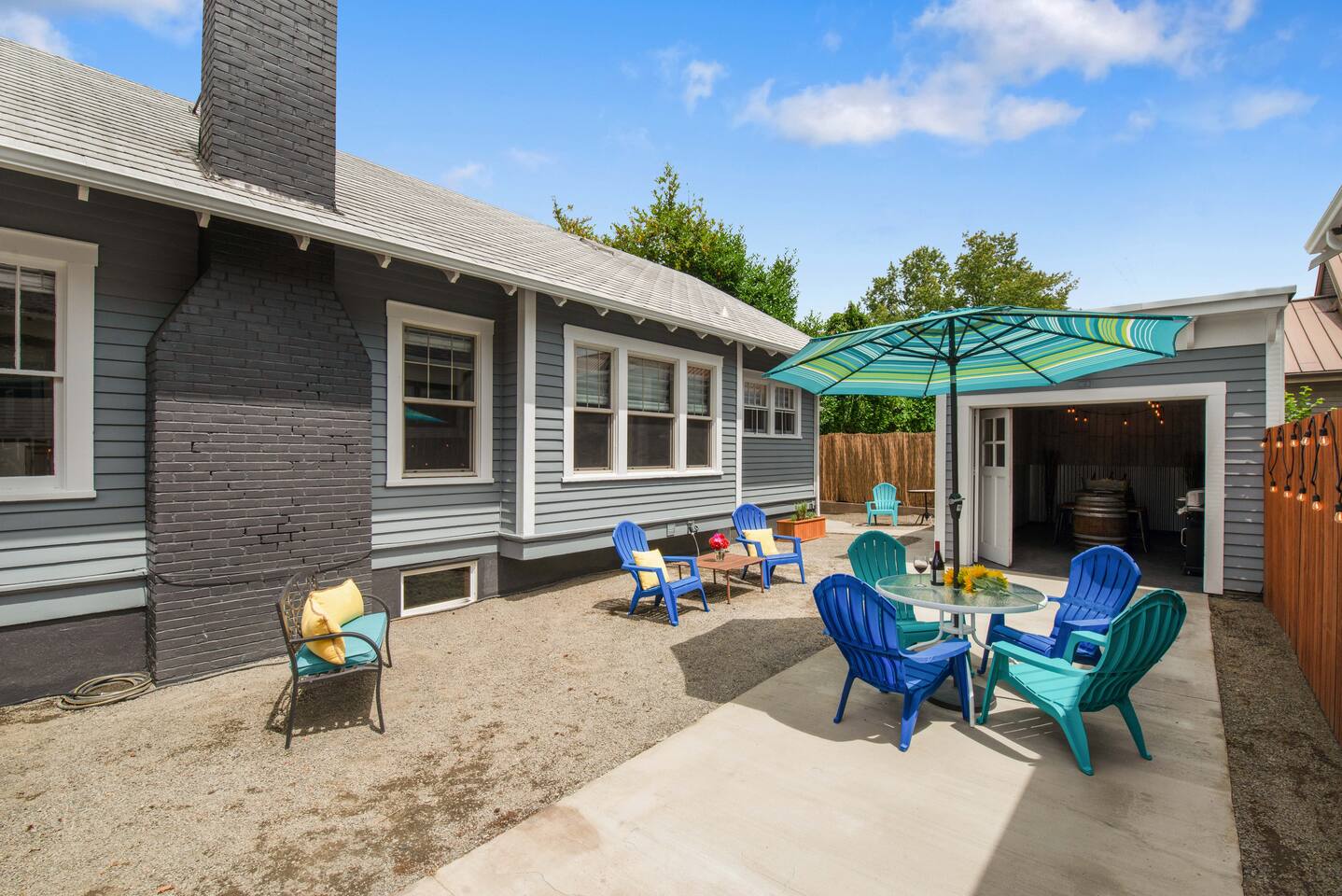 Step into our beautifully restored 1910 Craftsman Bungalow & Carriage House - an inviting blend of timeless character and modern comfort. Original details of warm wood trim, charming built-ins, and restored hardwood floors give the home its soul, while thoughtful updates throughout make the space feel fresh, clean, and relaxing. The open layout flows effortlessly from the cozy living room with a fireplace into the bright dining area and modern kitchen. The kitchen is both stylish and functional, featuring a concrete countertop peninsula that doubles as a casual gathering spot—perfect for morning coffee and meal prep. The dining room is anchored by a beautiful, oversized wood table that’s ideal for lingering dinners, spreading out board games, or doubling as a comfortable workspace for remote work. The home offers excellent privacy for couples, families, or friends traveling together. The private primary suite offers a king bed and a beautifully designed compact ensuite bath. In a unique historic touch, original French doors from the home were converted into a sliding barn-style door, paired with a fully tiled bath and updated fixtures. At the opposite end of the home, a spacious 2nd bedroom features a queen bed, with an adjacent full bathroom that also serves as the home's main bathroom. Just off to the kitchen is the laundry room with a full-size washer and dryer, which adds extra convenience for longer stays. Outdoor living is where this property truly shines. Enjoy the classic covered front porch with comfortable lounge chairs—perfect for sipping coffee and watching the neighborhood stroll by. Out back, open the historic roller door, and the carriage house transforms into a covered open-air entertaining space that flows directly into the fully fenced yard. With ceiling string lights, a rustic wood slab table on wine barrels, bistro chairs, and the BBQ placed right at the entrance, it’s the perfect spot to gather with your pups, enjoy umbrella shade during the day, or the heat lamp, and twinkle lights in the evening.