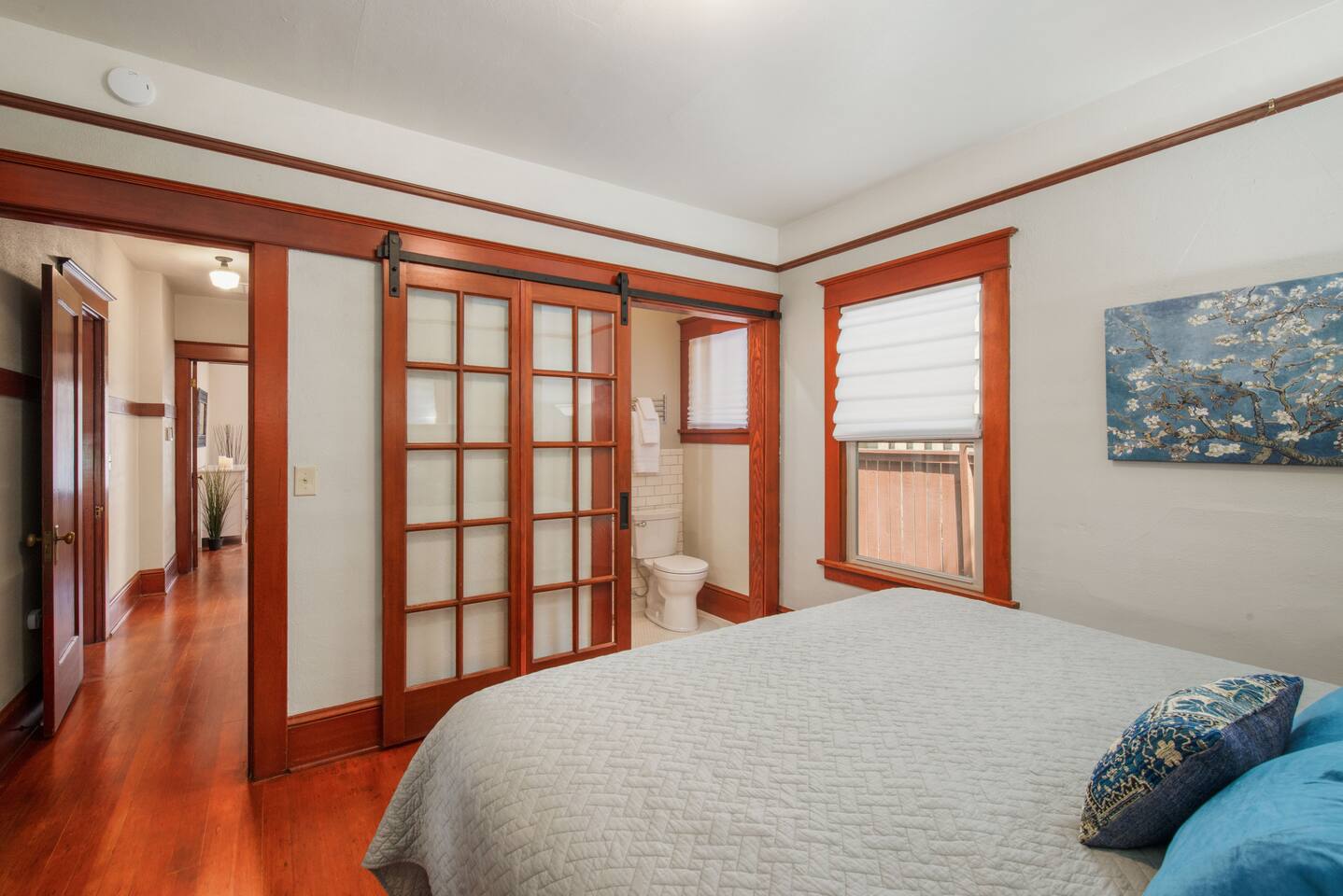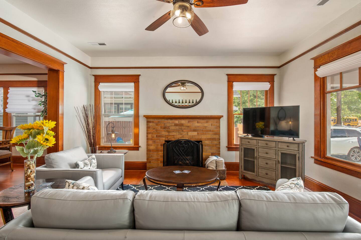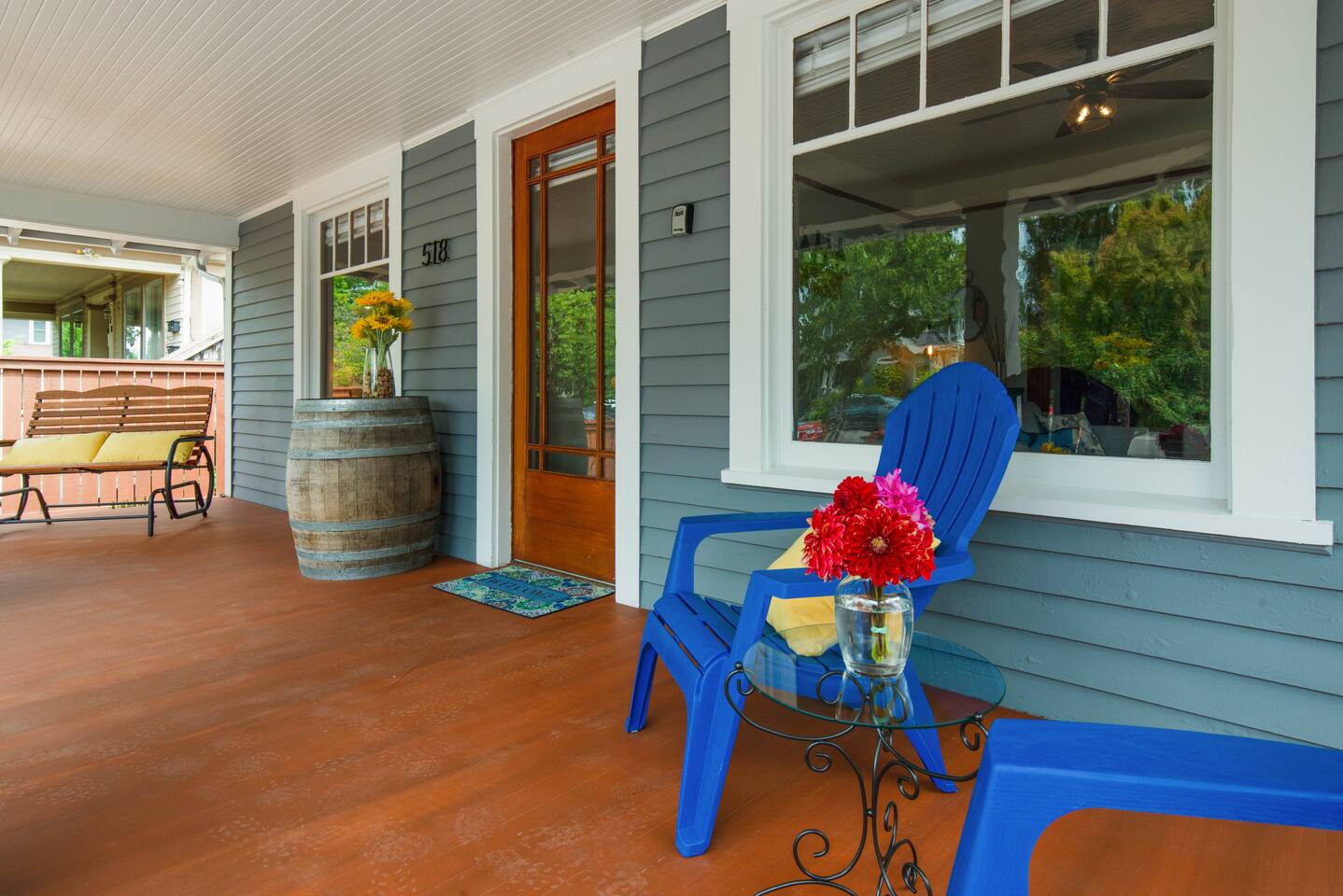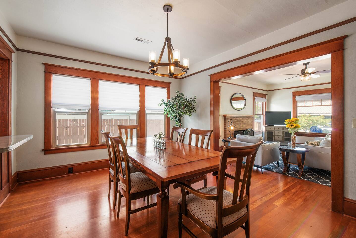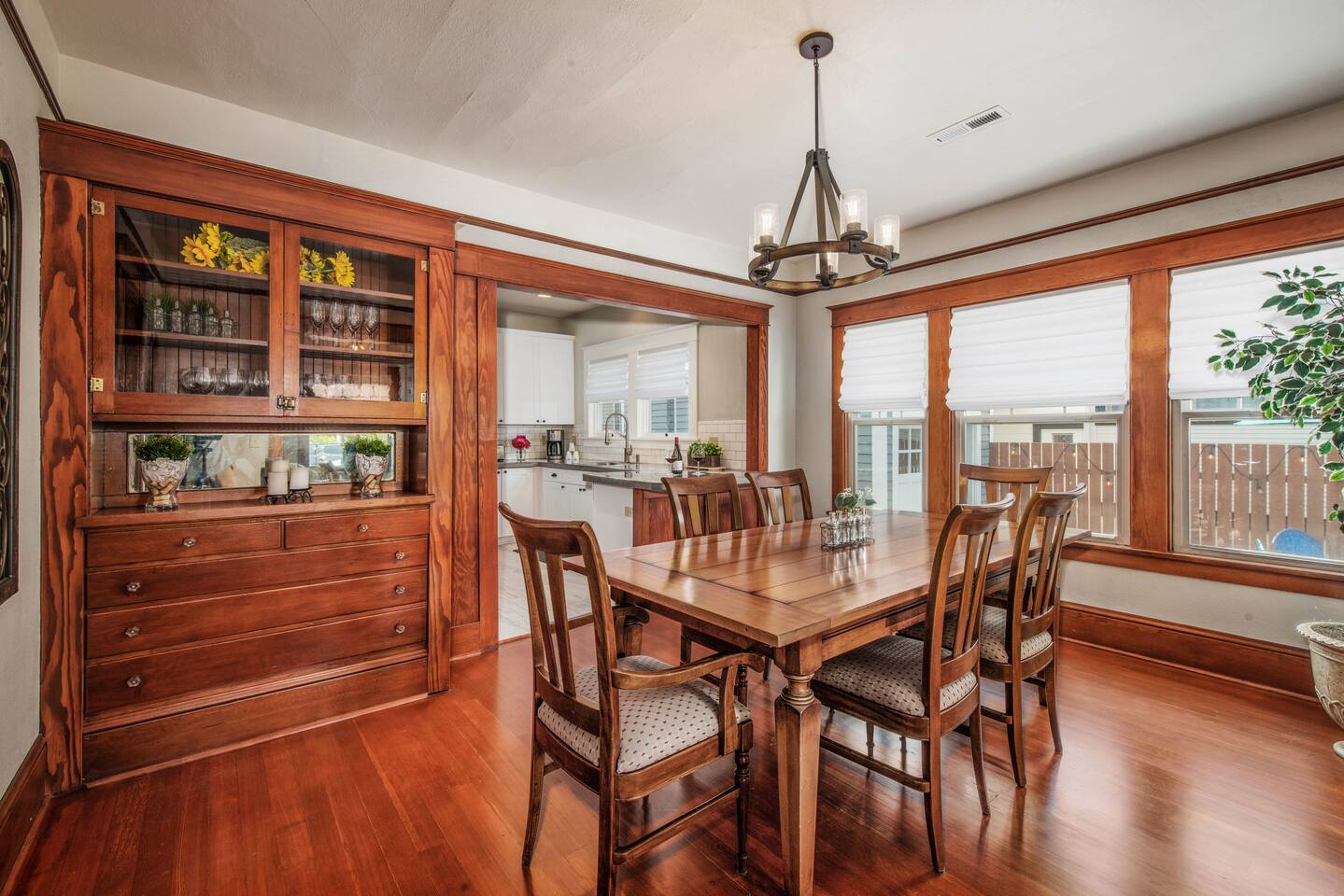 Step into our beautifully restored 1910 Craftsman Bungalow & Carriage House - an inviting blend of timeless character and modern comfort. Original details of warm wood trim, charming built-ins, and restored hardwood floors give the home its soul, while thoughtful updates throughout make the space feel fresh, clean, and relaxing. The open layout flows effortlessly from the cozy living room with a fireplace into the bright dining area and modern kitchen. The kitchen is both stylish and functional, featuring a concrete countertop peninsula that doubles as a casual gathering spot—perfect for morning coffee and meal prep. The dining room is anchored by a beautiful, oversized wood table that’s ideal for lingering dinners, spreading out board games, or doubling as a comfortable workspace for remote work. The home offers excellent privacy for couples, families, or friends traveling together. The private primary suite offers a king bed and a beautifully designed compact ensuite bath. In a unique historic touch, original French doors from the home were converted into a sliding barn-style door, paired with a fully tiled bath and updated fixtures. At the opposite end of the home, a spacious 2nd bedroom features a queen bed, with an adjacent full bathroom that also serves as the home's main bathroom. Just off to the kitchen is the laundry room with a full-size washer and dryer, which adds extra convenience for longer stays. Outdoor living is where this property truly shines. Enjoy the classic covered front porch with comfortable lounge chairs—perfect for sipping coffee and watching the neighborhood stroll by. Out back, open the historic roller door, and the carriage house transforms into a covered open-air entertaining space that flows directly into the fully fenced yard. With ceiling string lights, a rustic wood slab table on wine barrels, bistro chairs, and the BBQ placed right at the entrance, it’s the perfect spot to gather with your pups, enjoy umbrella shade during the day, or the heat lamp, and twinkle lights in the evening.