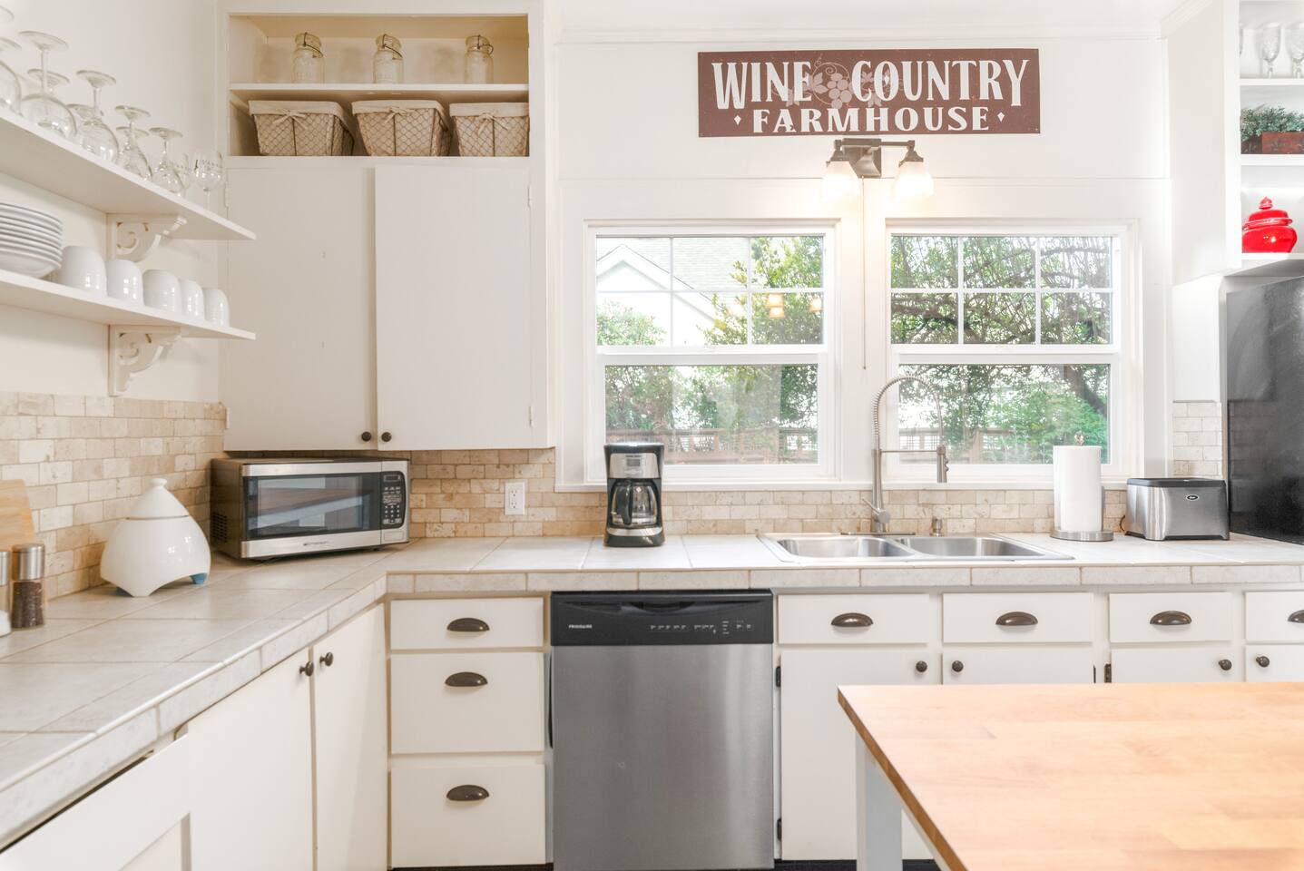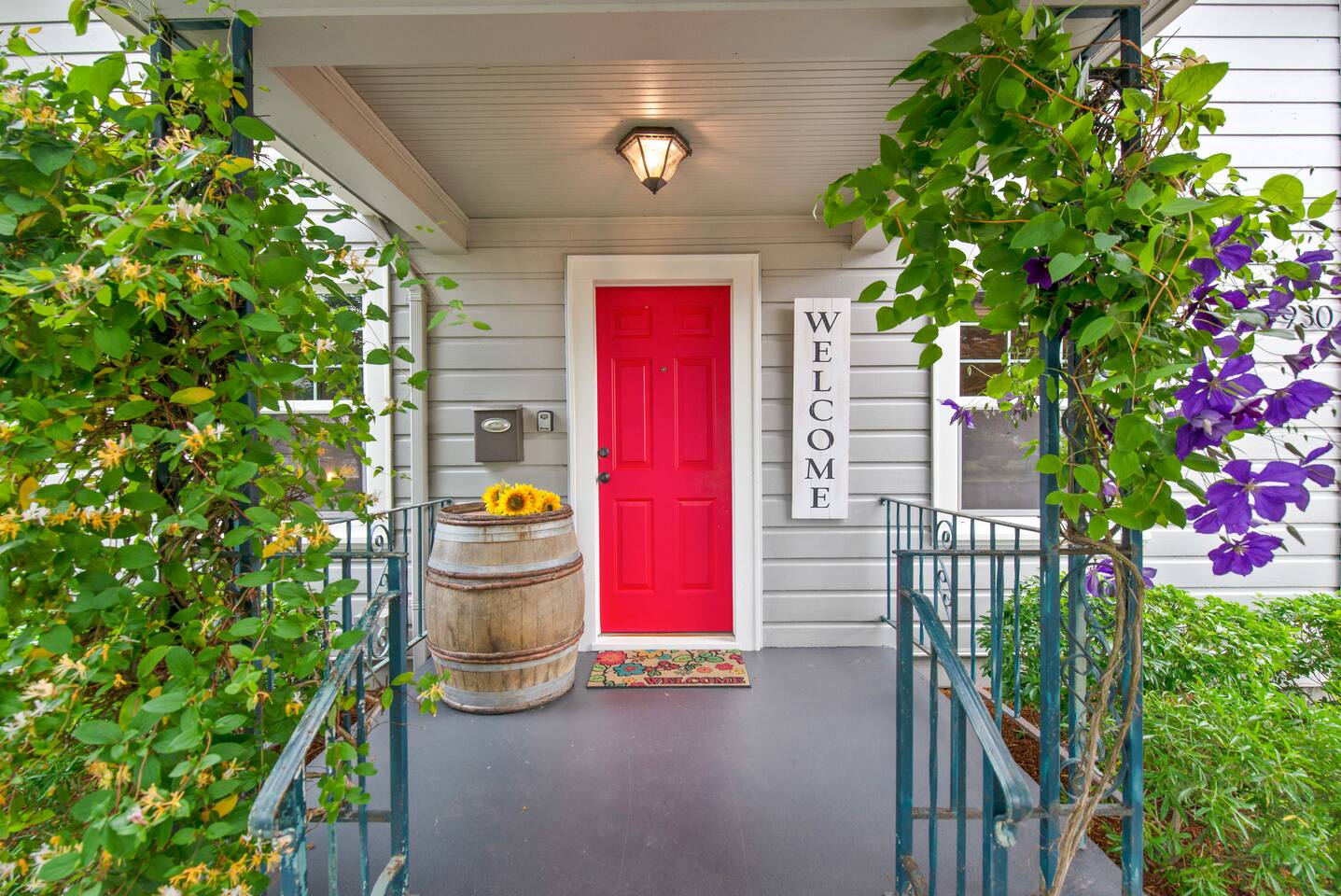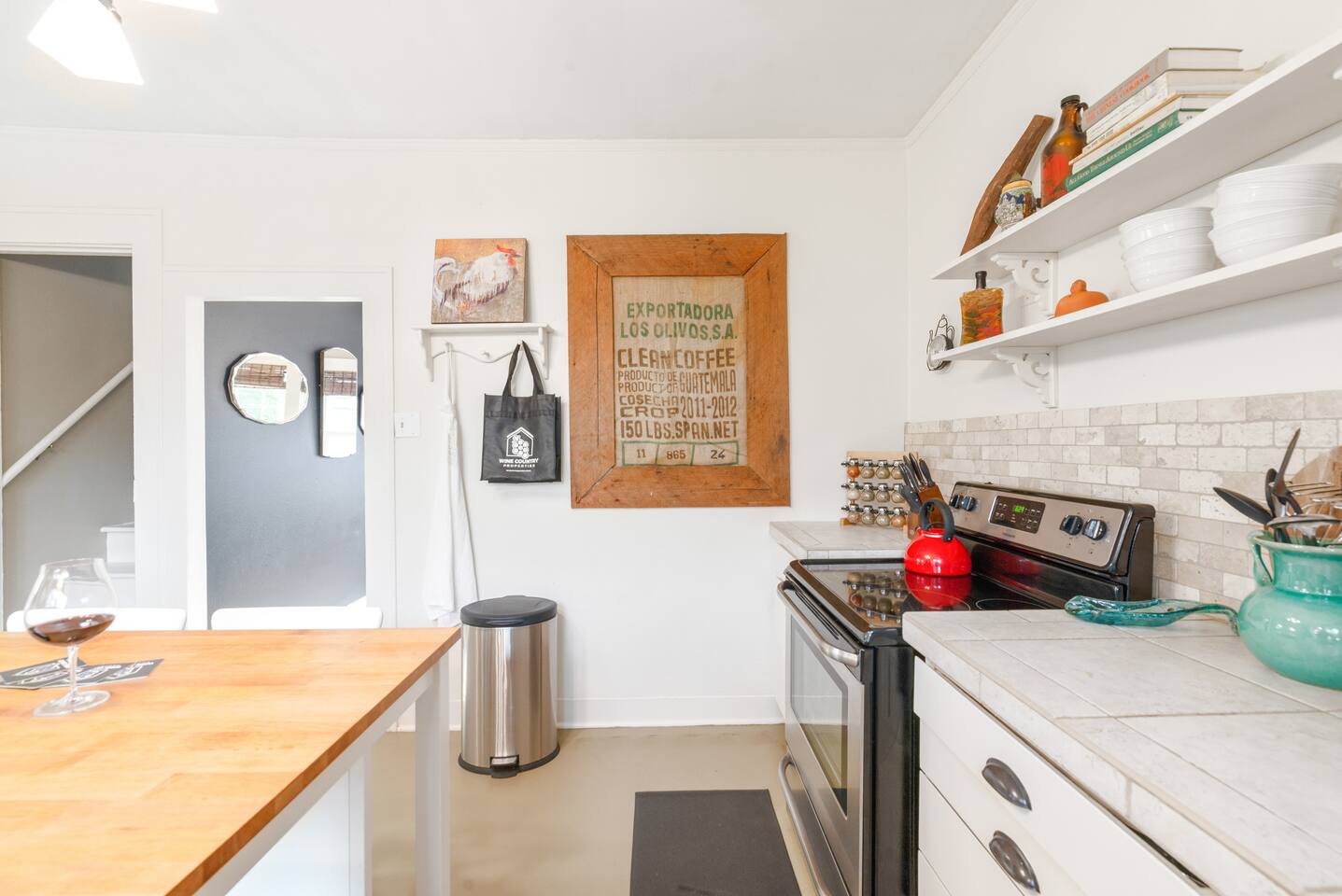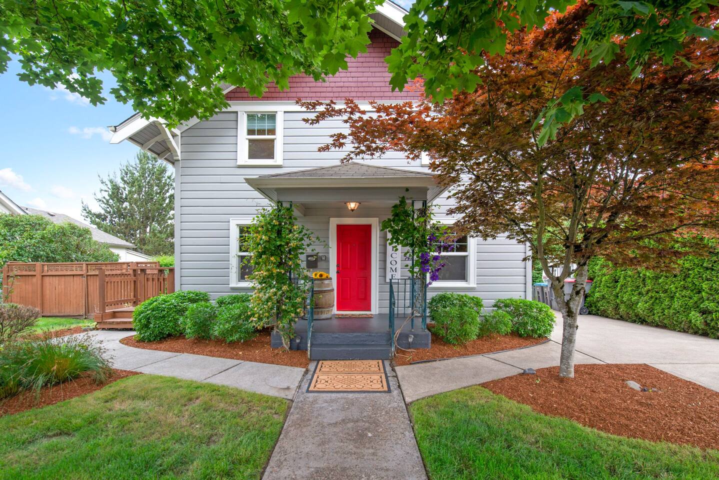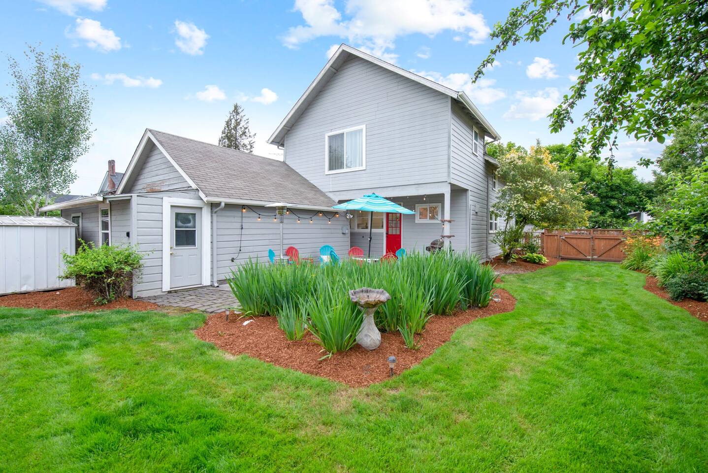Layout & Main Floor: This updated, lovingly cared-for two-story Wine Country Farmhouse is warm and welcoming, designed for comfort and relaxation. High ceilings, period-inspired lighting, cozy furnishings, and an eclectic mix of treasured antiques and polished modern pieces create a relaxed, inviting atmosphere. The main level features an open flow between the living room and dining room, with a farmhouse-style kitchen that opens to the dining space and includes a bistro-height island—perfect for gathering, sharing meals, and enjoying locally roasted coffee in the mornings. Main Floor Bedroom + Convenience: Also on the main floor, you’ll find a comfortable bedroom with a queen bed and its own private patio deck with seating, tucked inside the fully fenced backyard—an ideal little retreat for morning sun or quiet evenings. For added convenience, the main floor includes a full bathroom and a laundry room with a full-size washer and dryer, making longer stays easier and more comfortable. Upstairs Privacy + Backyard Living: Upstairs offers a wonderfully private layout with sleeping spaces on opposite sides of the home. One side features a spacious primary bedroom with a king bed and a full bathroom with a sliding barn-style door, while the other side offers a bright queen bedroom accented with a beautiful tree mural. Between the two bedrooms is a large landing with a dedicated workspace and cozy reading nook. Step outside to enjoy the spacious, fully fenced backyard, featuring a patio with partial cover, a BBQ grill, plenty of outdoor seating with umbrella shade, and relax into the evening with twinkle lights and a heat lamp overhead—a perfect place to gather while watching your pups run and play.