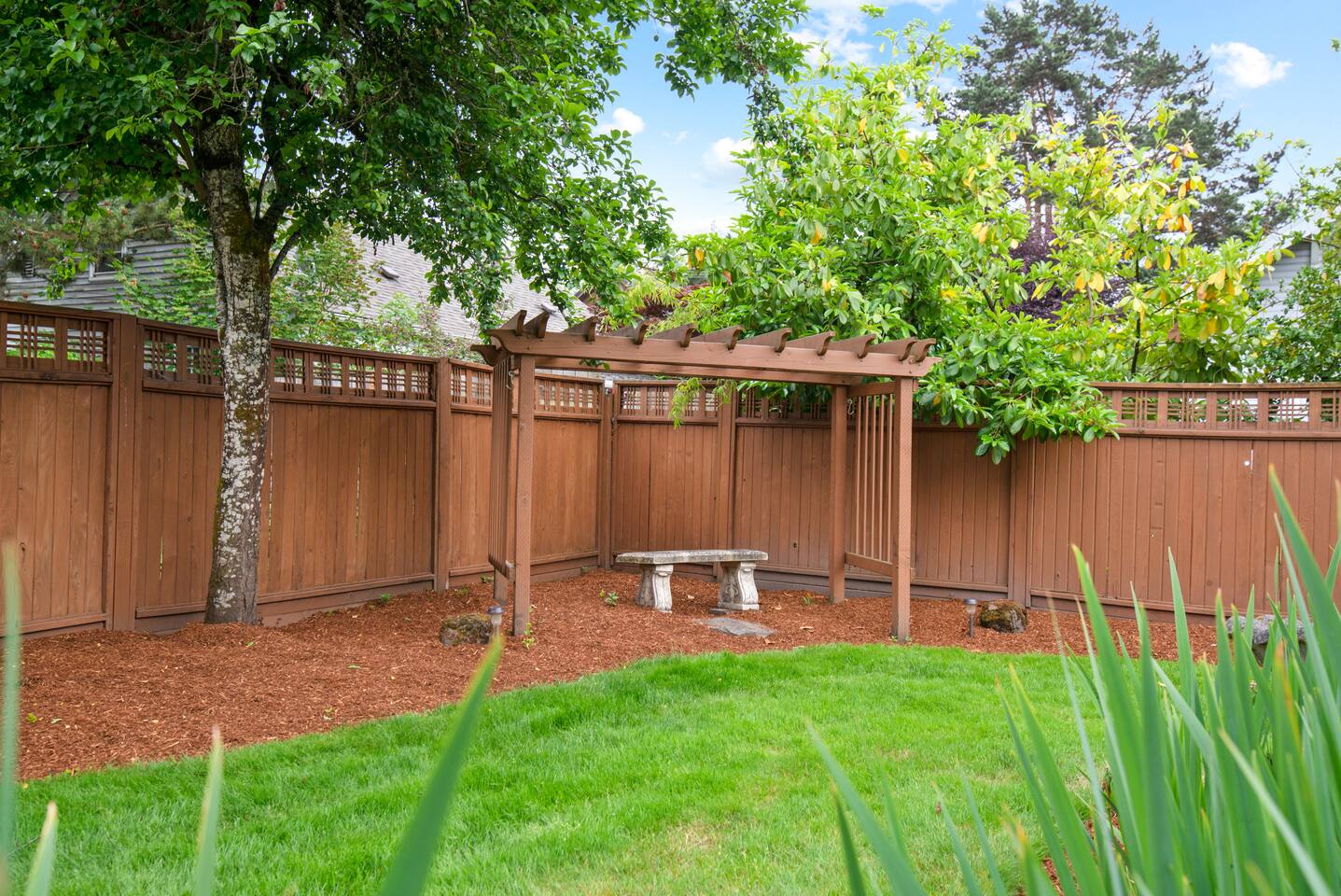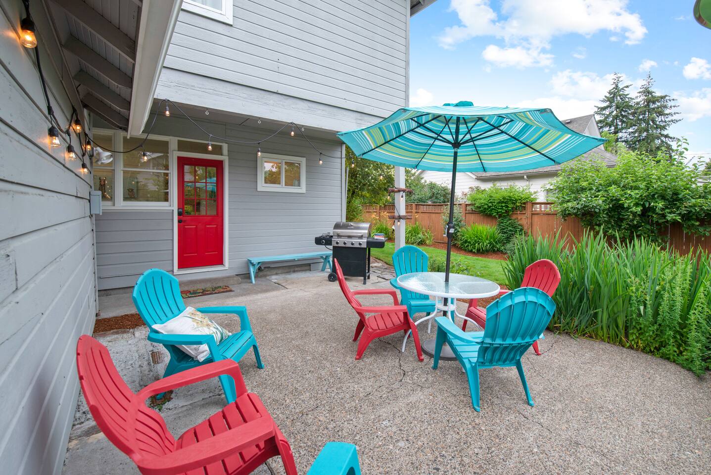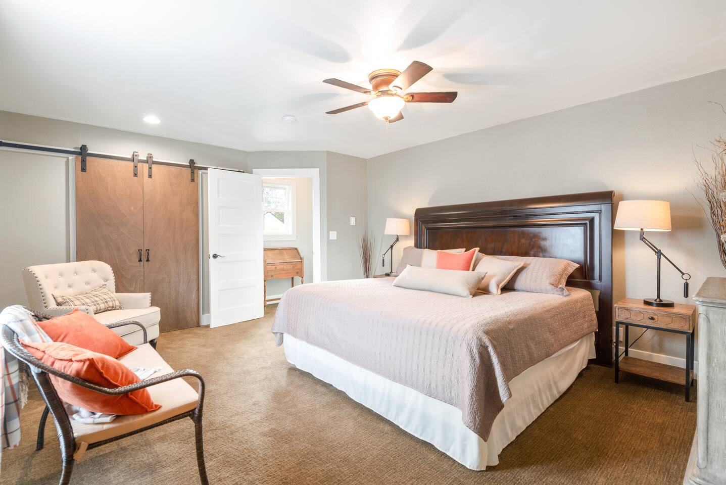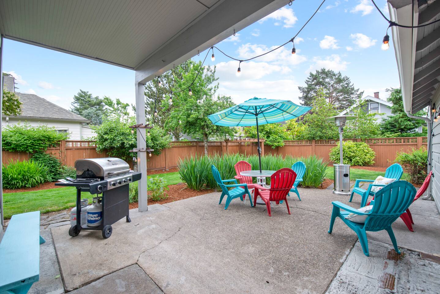 Layout & Main Floor: This updated, lovingly cared-for two-story Wine Country Farmhouse is warm and welcoming, designed for comfort and relaxation. High ceilings, period-inspired lighting, cozy furnishings, and an eclectic mix of treasured antiques and polished modern pieces create a relaxed, inviting atmosphere. The main level features an open flow between the living room and dining room, with a farmhouse-style kitchen that opens to the dining space and includes a bistro-height island—perfect for gathering, sharing meals, and enjoying locally roasted coffee in the mornings. Main Floor Bedroom + Convenience: Also on the main floor, you’ll find a comfortable bedroom with a queen bed and its own private patio deck with seating, tucked inside the fully fenced backyard—an ideal little retreat for morning sun or quiet evenings. For added convenience, the main floor includes a full bathroom and a laundry room with a full-size washer and dryer, making longer stays easier and more comfortable. Upstairs Privacy + Backyard Living: Upstairs offers a wonderfully private layout with sleeping spaces on opposite sides of the home. One side features a spacious primary bedroom with a king bed and a full bathroom with a sliding barn-style door, while the other side offers a bright queen bedroom accented with a beautiful tree mural. Between the two bedrooms is a large landing with a dedicated workspace and cozy reading nook. Step outside to enjoy the spacious, fully fenced backyard, featuring a patio with partial cover, a BBQ grill, plenty of outdoor seating with umbrella shade, and relax into the evening with twinkle lights and a heat lamp overhead—a perfect place to gather while watching your pups run and play.