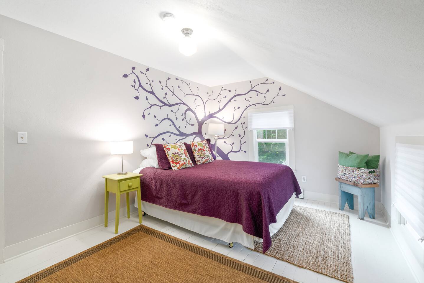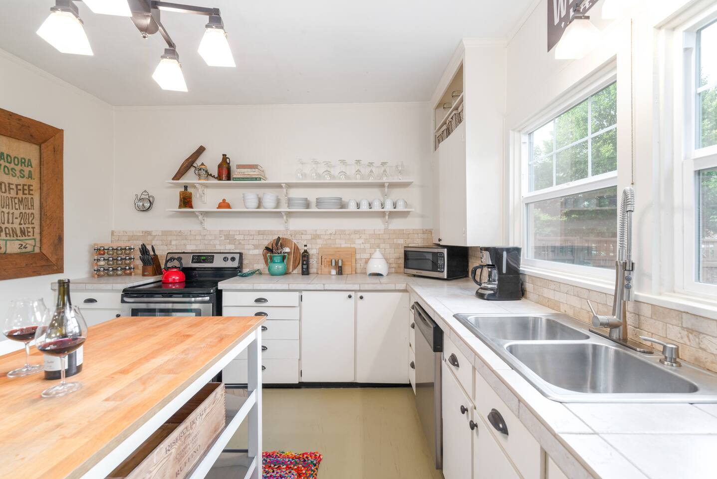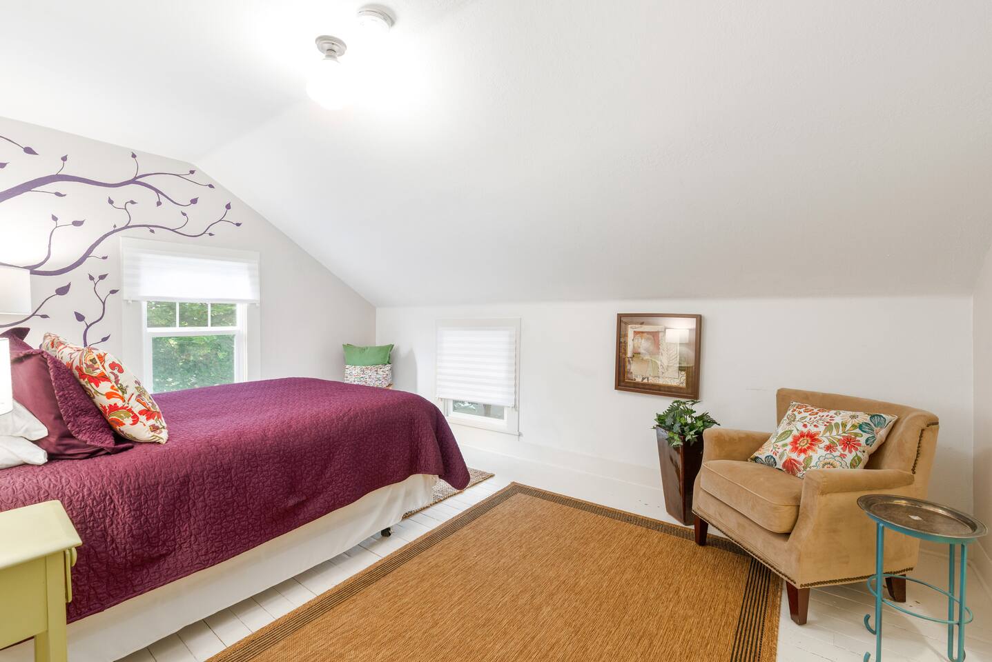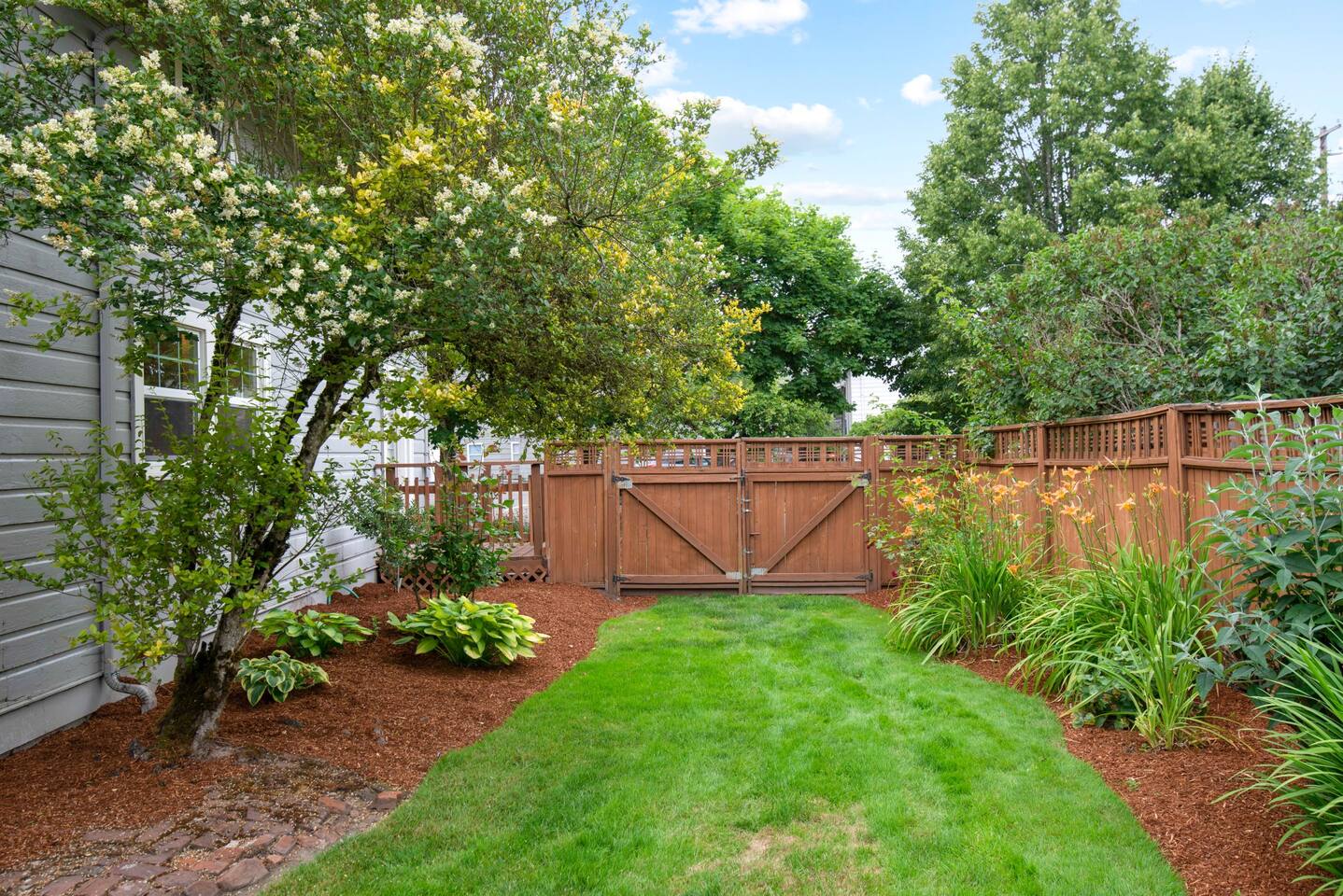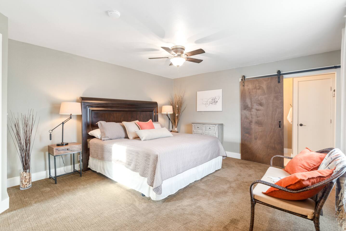 Layout & Main Floor: This updated, lovingly cared-for two-story Wine Country Farmhouse is warm and welcoming, designed for comfort and relaxation. High ceilings, period-inspired lighting, cozy furnishings, and an eclectic mix of treasured antiques and polished modern pieces create a relaxed, inviting atmosphere. The main level features an open flow between the living room and dining room, with a farmhouse-style kitchen that opens to the dining space and includes a bistro-height island—perfect for gathering, sharing meals, and enjoying locally roasted coffee in the mornings. Main Floor Bedroom + Convenience: Also on the main floor, you’ll find a comfortable bedroom with a queen bed and its own private patio deck with seating, tucked inside the fully fenced backyard—an ideal little retreat for morning sun or quiet evenings. For added convenience, the main floor includes a full bathroom and a laundry room with a full-size washer and dryer, making longer stays easier and more comfortable. Upstairs Privacy + Backyard Living: Upstairs offers a wonderfully private layout with sleeping spaces on opposite sides of the home. One side features a spacious primary bedroom with a king bed and a full bathroom with a sliding barn-style door, while the other side offers a bright queen bedroom accented with a beautiful tree mural. Between the two bedrooms is a large landing with a dedicated workspace and cozy reading nook. Step outside to enjoy the spacious, fully fenced backyard, featuring a patio with partial cover, a BBQ grill, plenty of outdoor seating with umbrella shade, and relax into the evening with twinkle lights and a heat lamp overhead—a perfect place to gather while watching your pups run and play.