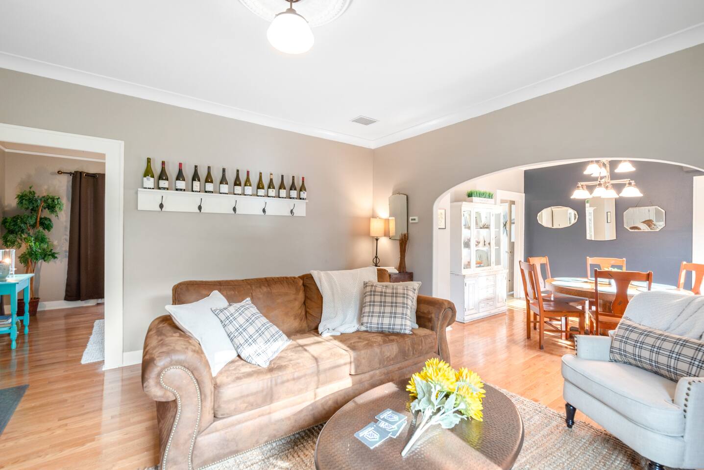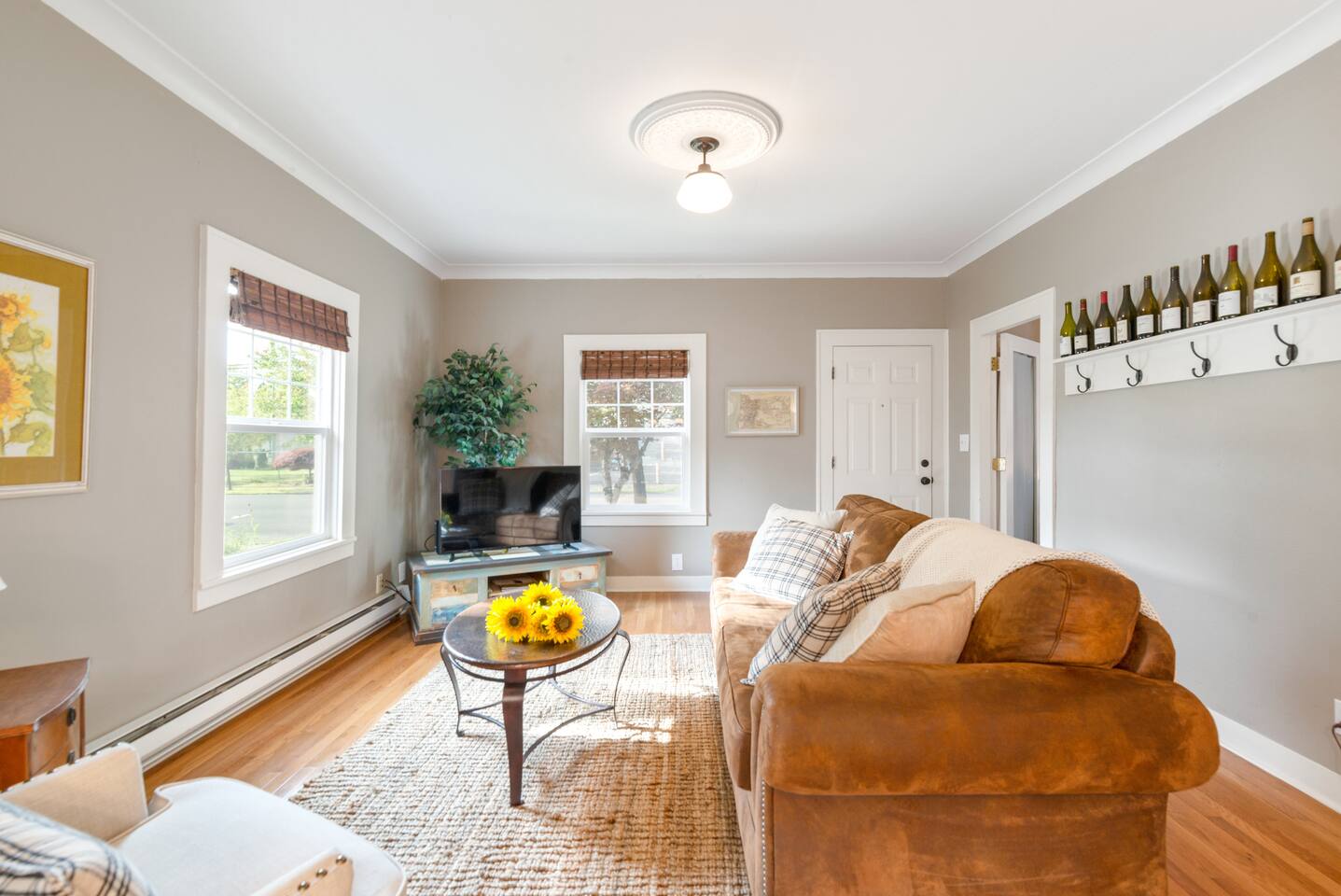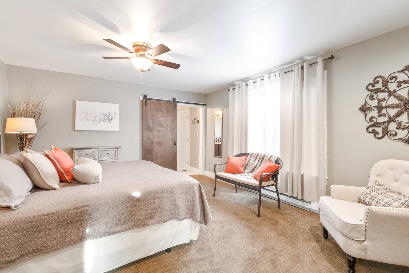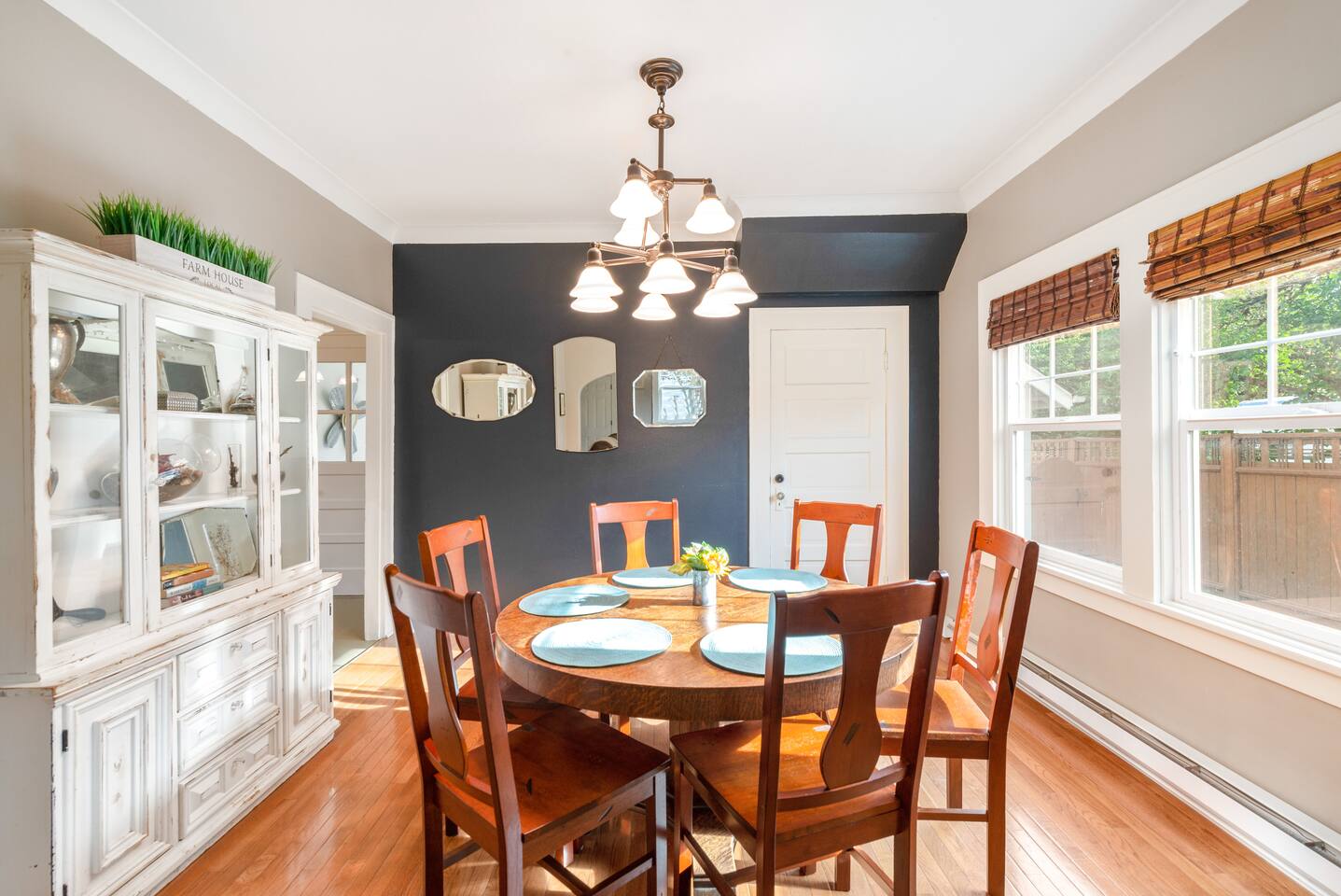 Layout & Main Floor: This updated, lovingly cared-for two-story Wine Country Farmhouse is warm and welcoming, designed for comfort and relaxation. High ceilings, period-inspired lighting, cozy furnishings, and an eclectic mix of treasured antiques and polished modern pieces create a relaxed, inviting atmosphere. The main level features an open flow between the living room and dining room, with a farmhouse-style kitchen that opens to the dining space and includes a bistro-height island—perfect for gathering, sharing meals, and enjoying locally roasted coffee in the mornings. Main Floor Bedroom + Convenience: Also on the main floor, you’ll find a comfortable bedroom with a queen bed and its own private patio deck with seating, tucked inside the fully fenced backyard—an ideal little retreat for morning sun or quiet evenings. For added convenience, the main floor includes a full bathroom and a laundry room with a full-size washer and dryer, making longer stays easier and more comfortable. Upstairs Privacy + Backyard Living: Upstairs offers a wonderfully private layout with sleeping spaces on opposite sides of the home. One side features a spacious primary bedroom with a king bed and a full bathroom with a sliding barn-style door, while the other side offers a bright queen bedroom accented with a beautiful tree mural. Between the two bedrooms is a large landing with a dedicated workspace and cozy reading nook. Step outside to enjoy the spacious, fully fenced backyard, featuring a patio with partial cover, a BBQ grill, plenty of outdoor seating with umbrella shade, and relax into the evening with twinkle lights and a heat lamp overhead—a perfect place to gather while watching your pups run and play.
