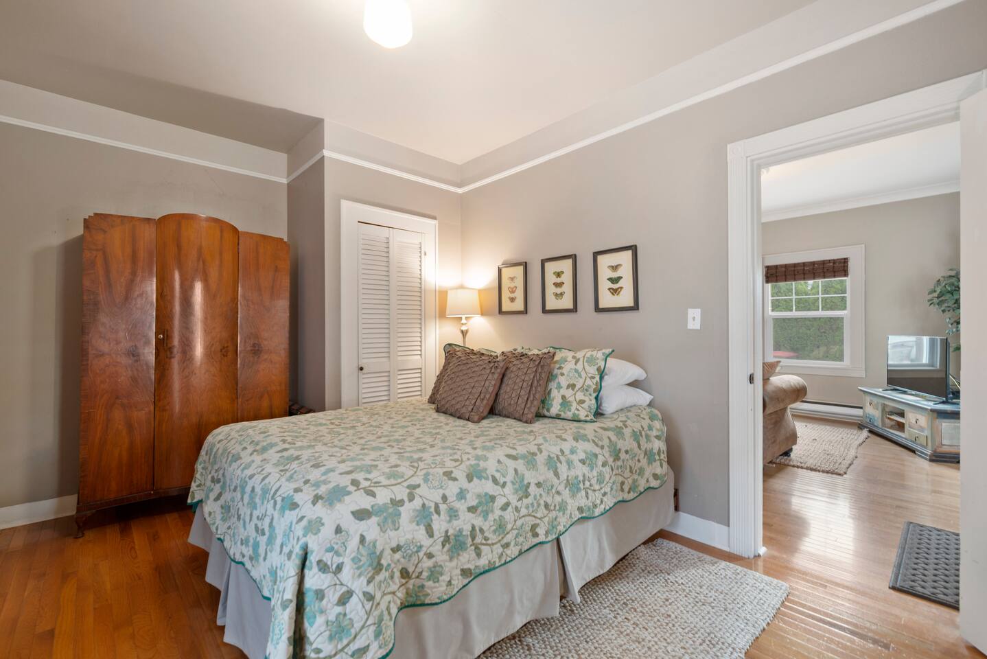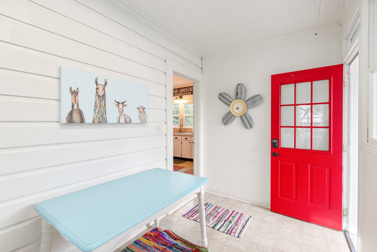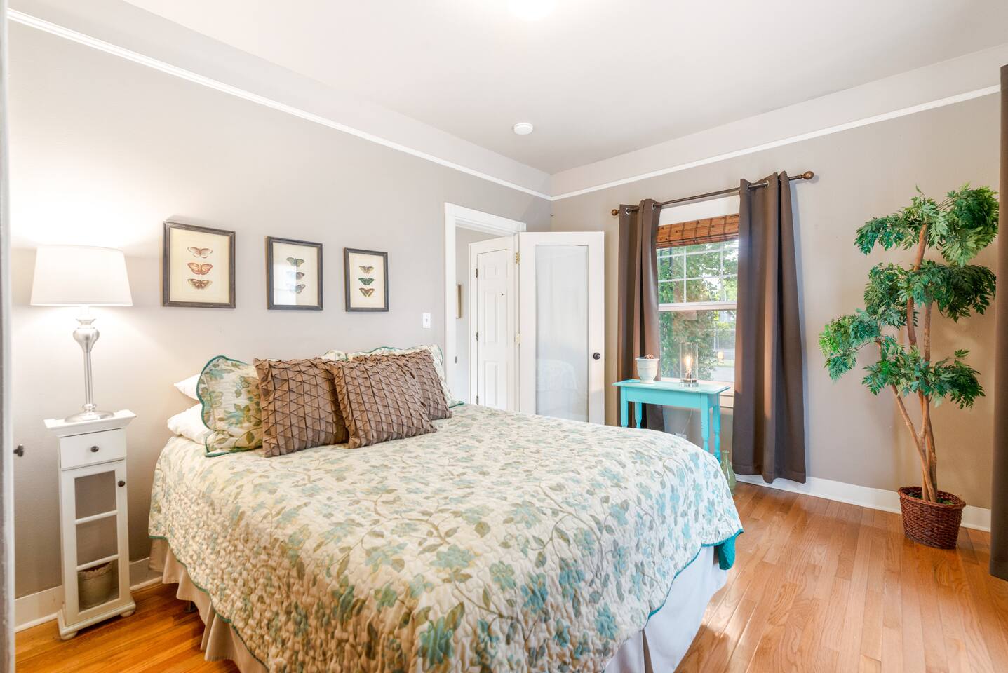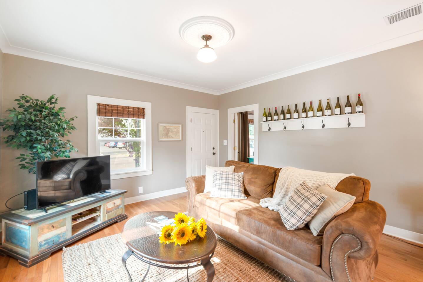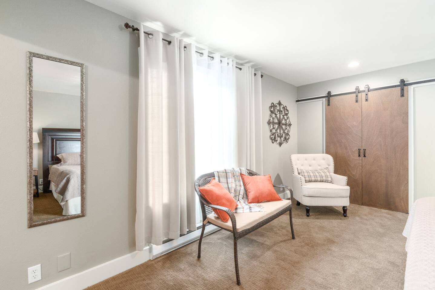 Layout & Main Floor: This updated, lovingly cared-for two-story Wine Country Farmhouse is warm and welcoming, designed for comfort and relaxation. High ceilings, period-inspired lighting, cozy furnishings, and an eclectic mix of treasured antiques and polished modern pieces create a relaxed, inviting atmosphere. The main level features an open flow between the living room and dining room, with a farmhouse-style kitchen that opens to the dining space and includes a bistro-height island—perfect for gathering, sharing meals, and enjoying locally roasted coffee in the mornings. Main Floor Bedroom + Convenience: Also on the main floor, you’ll find a comfortable bedroom with a queen bed and its own private patio deck with seating, tucked inside the fully fenced backyard—an ideal little retreat for morning sun or quiet evenings. For added convenience, the main floor includes a full bathroom and a laundry room with a full-size washer and dryer, making longer stays easier and more comfortable. Upstairs Privacy + Backyard Living: Upstairs offers a wonderfully private layout with sleeping spaces on opposite sides of the home. One side features a spacious primary bedroom with a king bed and a full bathroom with a sliding barn-style door, while the other side offers a bright queen bedroom accented with a beautiful tree mural. Between the two bedrooms is a large landing with a dedicated workspace and cozy reading nook. Step outside to enjoy the spacious, fully fenced backyard, featuring a patio with partial cover, a BBQ grill, plenty of outdoor seating with umbrella shade, and relax into the evening with twinkle lights and a heat lamp overhead—a perfect place to gather while watching your pups run and play.