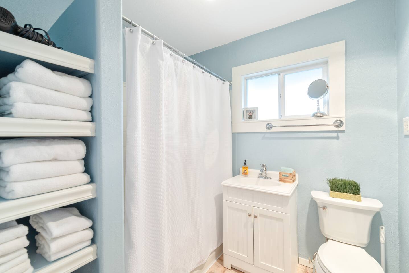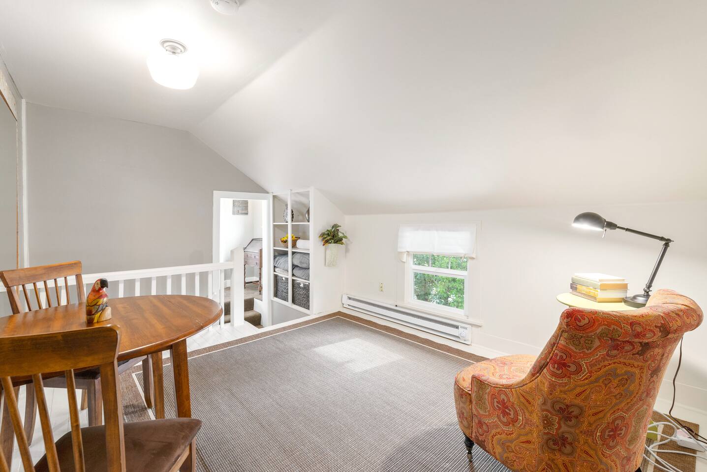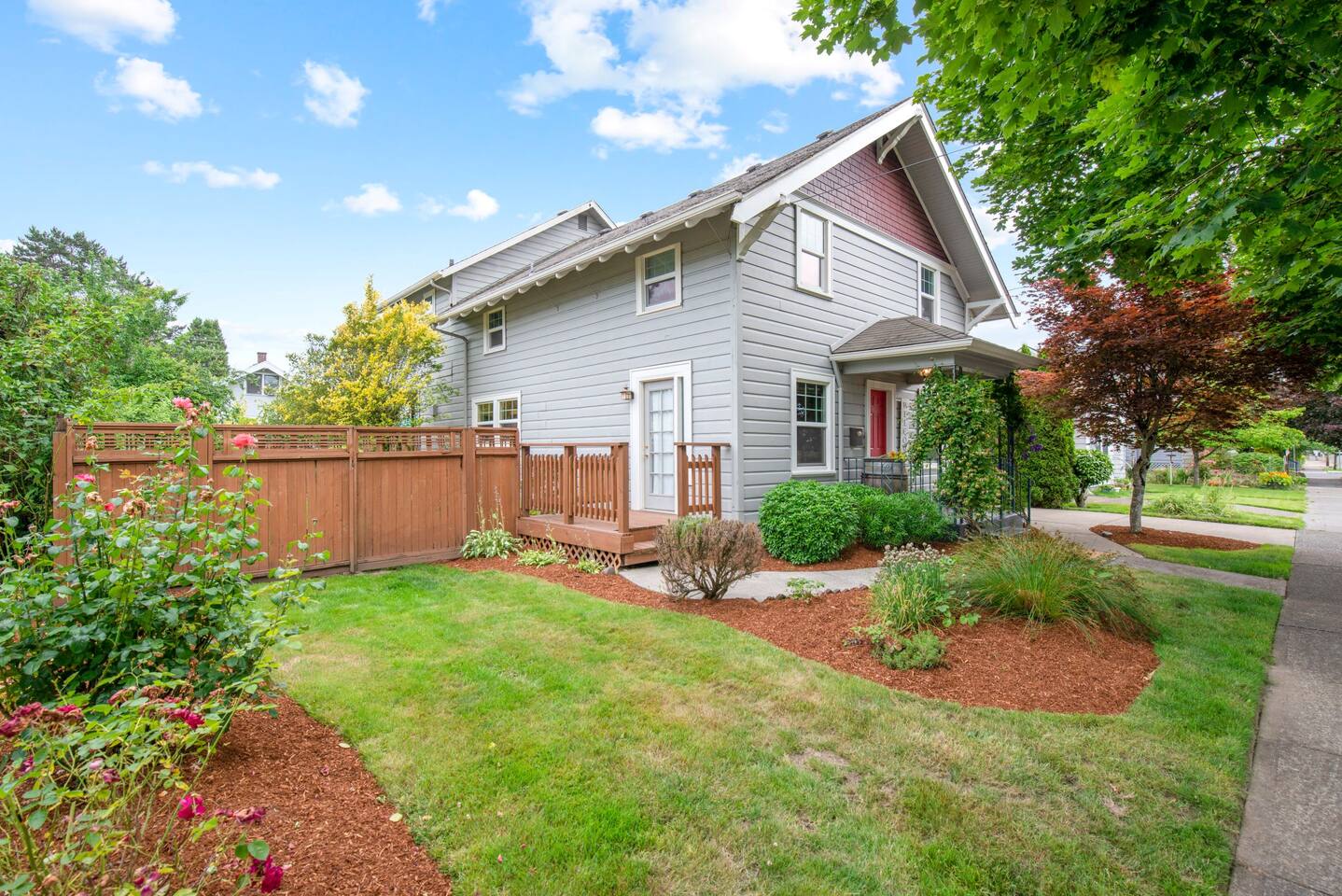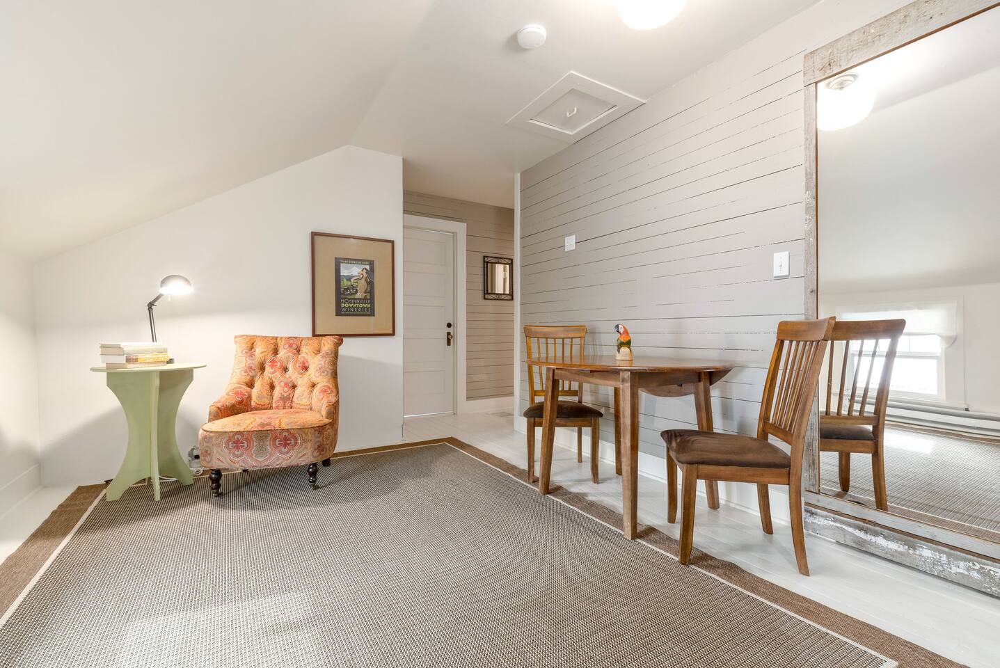 Traveling with a larger group? Ask about the Cowls Bungalow & Carriage House, and the 1939 Vintage House - all in downtown McMinnville. Morning Coffee: Enjoy locally roasted whole bean coffee from Table Top Roasters in Yamhill. In the kitchen, there will be a drip coffee maker, coffee grinder, creamer, and sugar. Fully Stocked Kitchen: Open the cabinets and drawers, and you'll find everything you need to whip up a quick meal or cook and bake your favorite holiday meals. The kitchen is also supplied with a spice rack, olive oil, vinegar, BBQ utensils, a meat thermometer, hot-pads, kitchen towels, and extra paper towels. Dog Friendly: We welcome your dog, and there is plenty of room for them to roam in the fully fenced backyard. (See our dog policy, but if your situation is a little different, don't hesitate to ask management to see if we can accommodate). Free Parking: As you pull up to the house, there is a paved parking space in front of the garage. You can also park on the street for free. Connectivity: High-speed Wi-Fi suitable for streaming and remote work. SmartTV: Connect to your favorite app channels, and there are 100's of live TV shows, news, movies, and music. Upstairs Landing Workspace: The upstairs landing has a table and two chairs. There is also a larger comfy chair with a reading lamp.